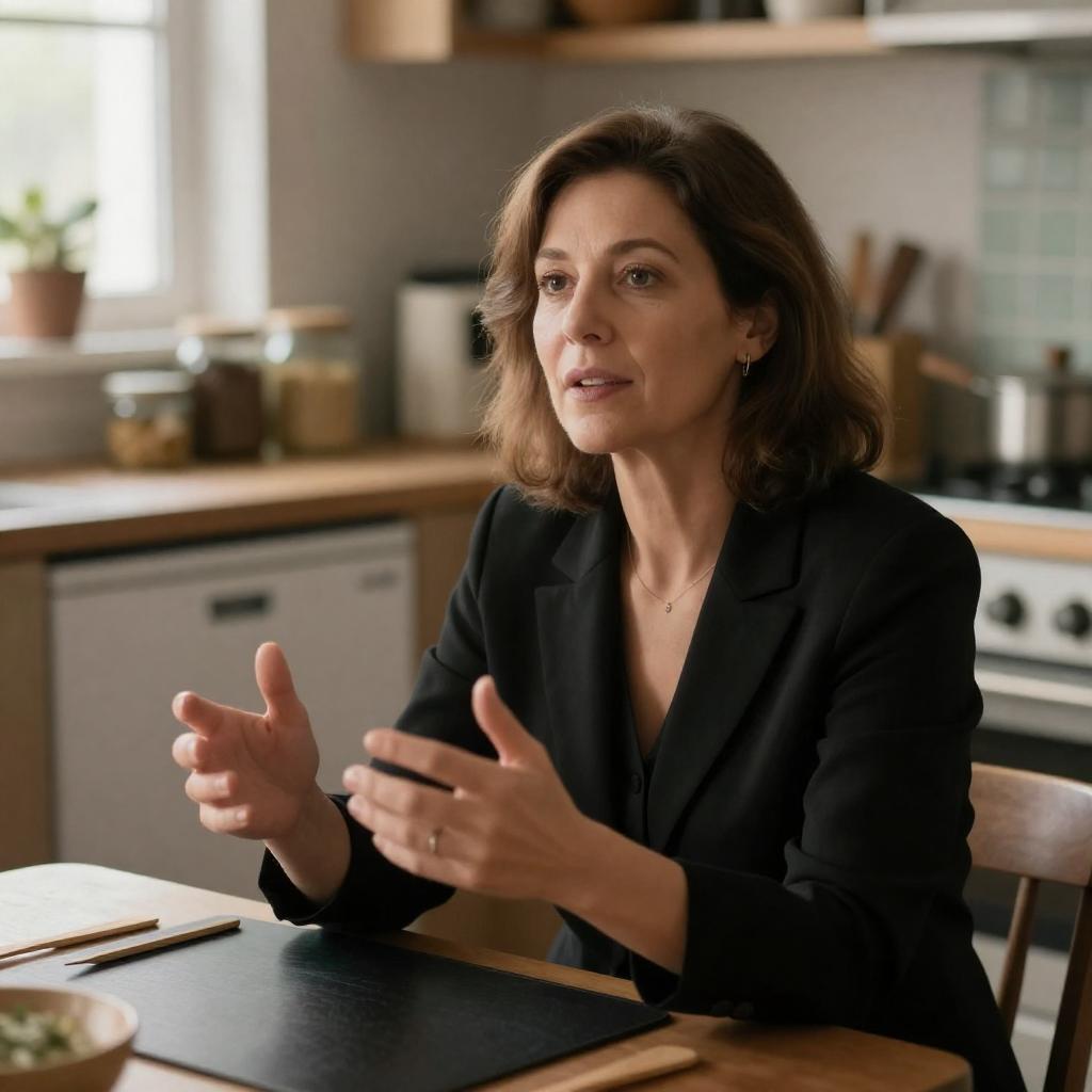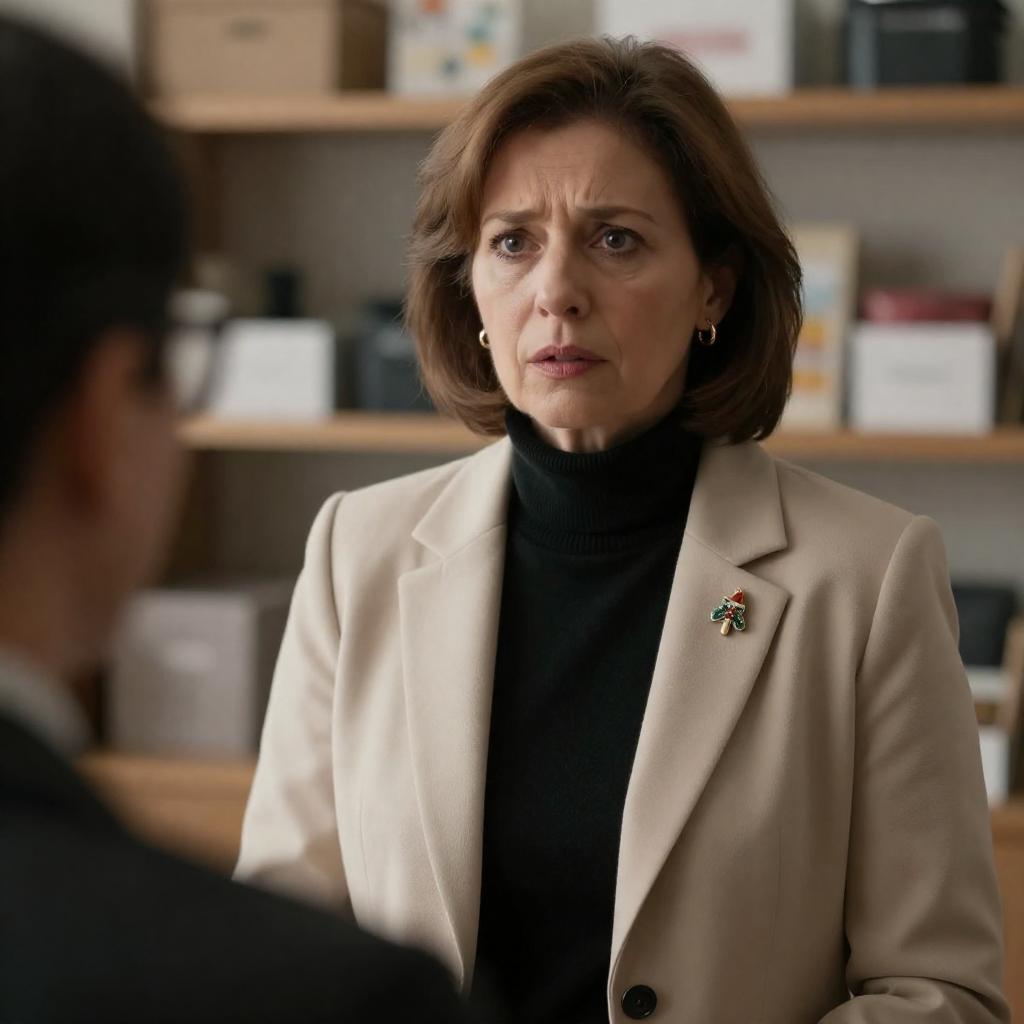 Middle-aged woman with short brown hair, beige blazer, black turtleneck, and small Christmas pin on her jacket. She has a concerned expression, looking to the left. Background: cluttered shelves with various items. Partially visible person in foreground.