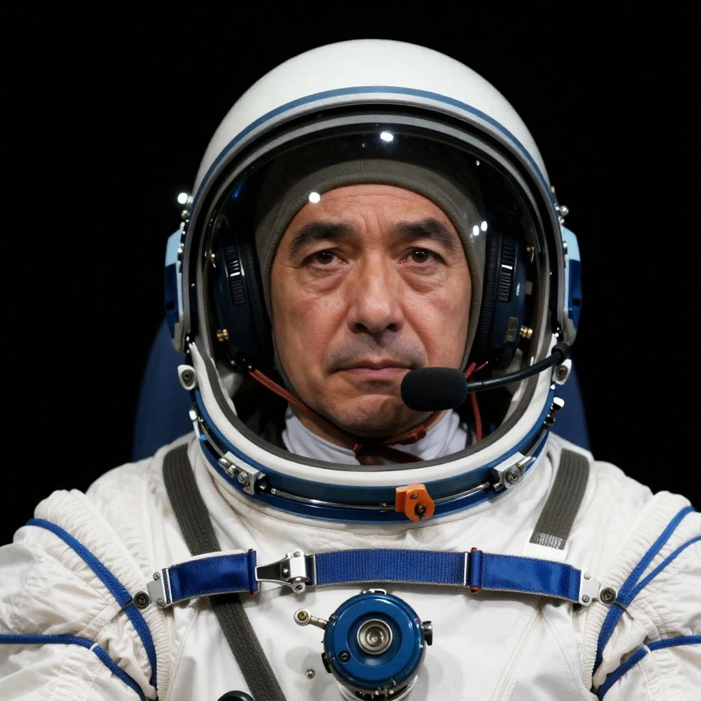 Photograph of a middle-aged man in a white astronaut suit with a yellow helmet and clear visor. He has short brown hair, a slight smile, and is looking to the right. Bright sunlight reflects on the visor. Blue background.