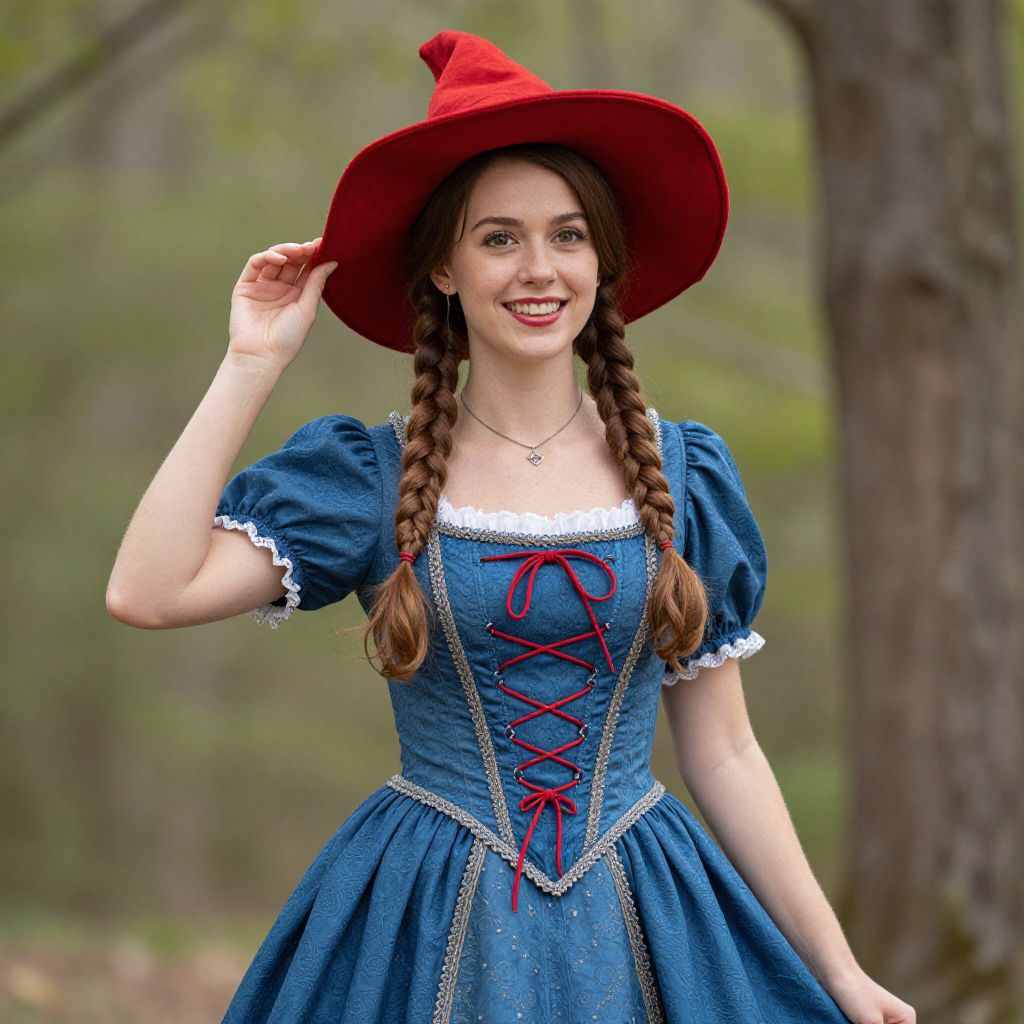 Photograph of a smiling young woman with fair skin, brown braided hair, wearing a red witch hat, blue medieval-style dress with white trim and