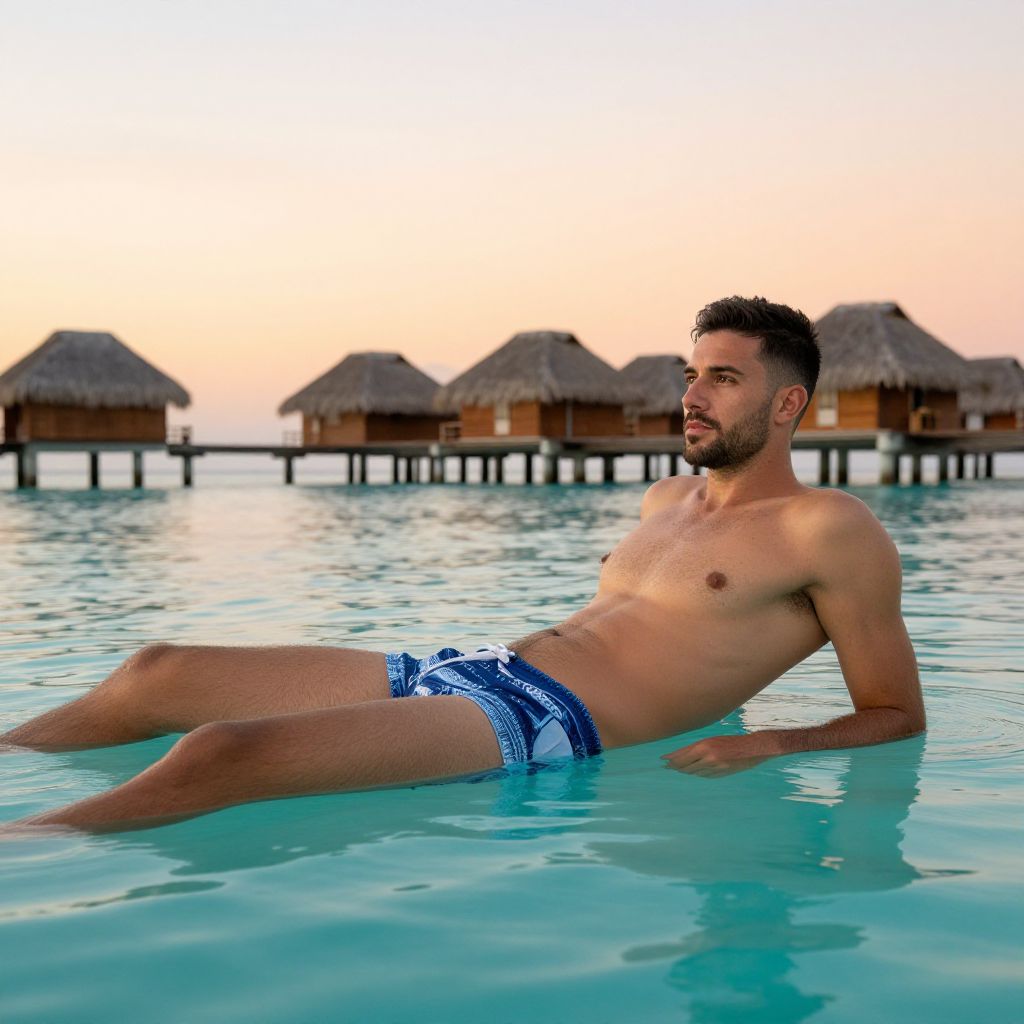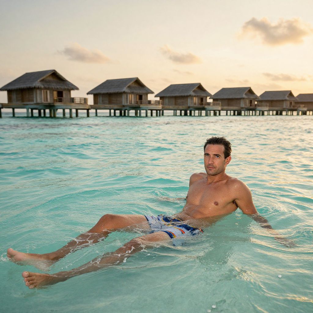 Photograph of a fit, shirtless man with short dark hair and a trimmed beard, lounging in turquoise water. He's wearing blue and white patterned swim trunks, with his legs extended and arms resting behind him. In the background, there are several thatched-roof overwater huts on stilts, set against a sunset sky with soft orange and pink hues. The water is clear and calm.