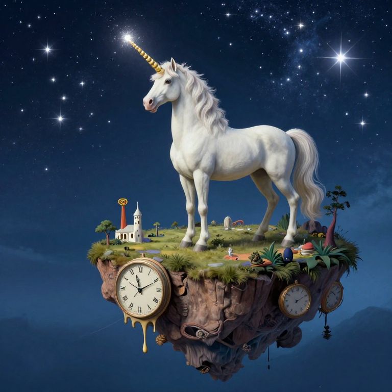 Craft an image embodying surreal enchantment, featuring a majestic unicorn perched atop a floating island in a boundless sea of twinkling stars. The creature's radiant horn mirrors the celestial lights above as it surveys a tranquil landscape below from its ethereal vantage point. This unique view from beneath the island should inspire awe and wonder, fusing the mythical allure of a magical beast with the enigmatic beauty of melting clocks and bizarre architectural elements reminiscent of Dali's iconic style, creating an emotional spectrum that spans both surreal charm and timeless intrigue.
