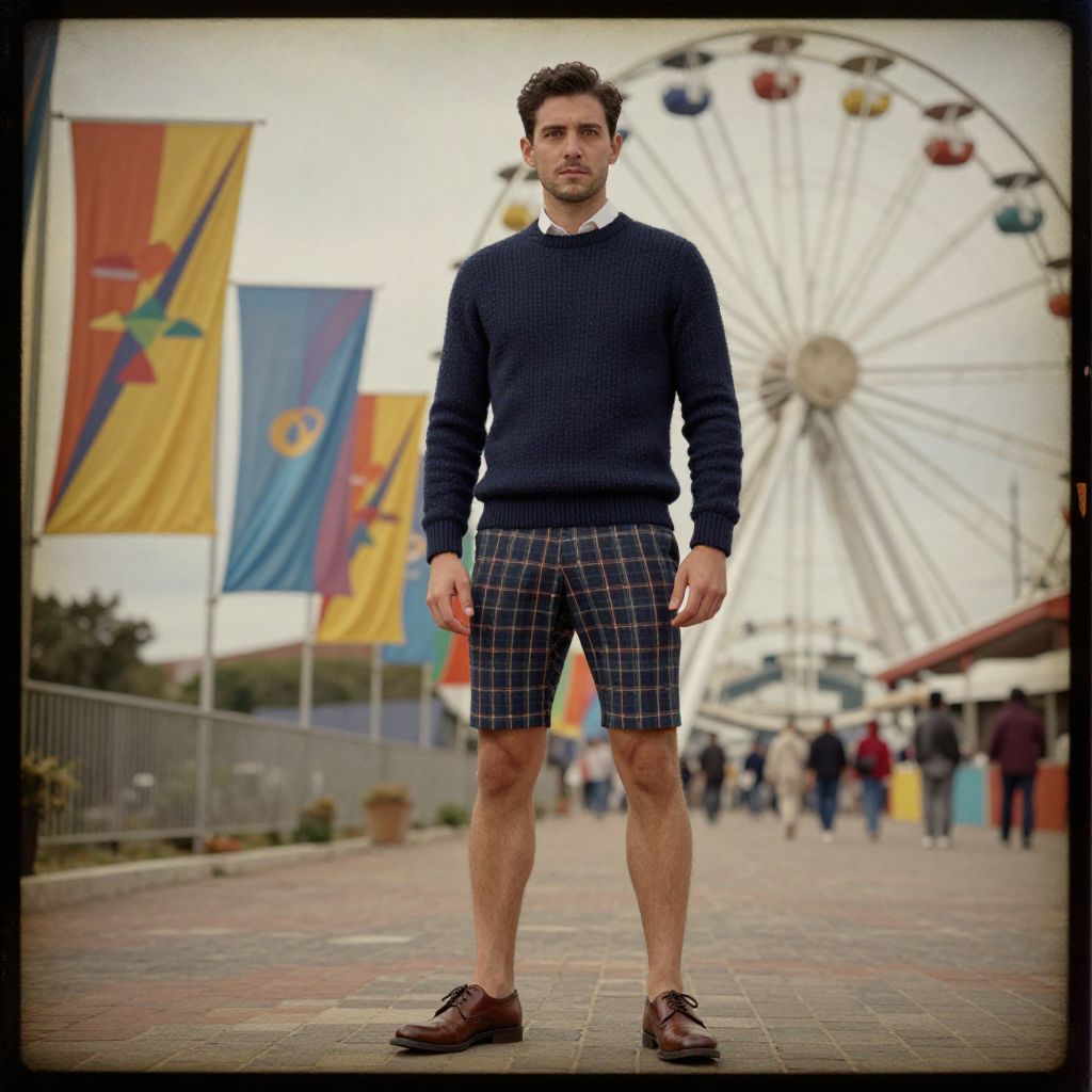 A man, navy blue merino wool cycling sweater, tailored plaid cycling shorts, classic leather saddle shoes, vibrant banners fluttering, Ferris wheel towering, daguerreotype film style, focused expression, nostalgic atmosphere. Man has masculine face and piercing eyes