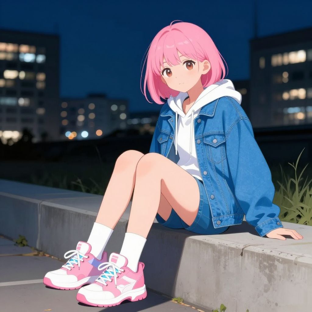 Illustration of a young anime-style girl with short pink hair and brown eyes, sitting outdoors at night on a concrete ledge. She is wearing a blue denim jacket over a hoodie, blue denim shorts, white socks, and colorful pink and white sneakers. The background features a cityscape with tall buildings illuminated by windows and a clear night sky.