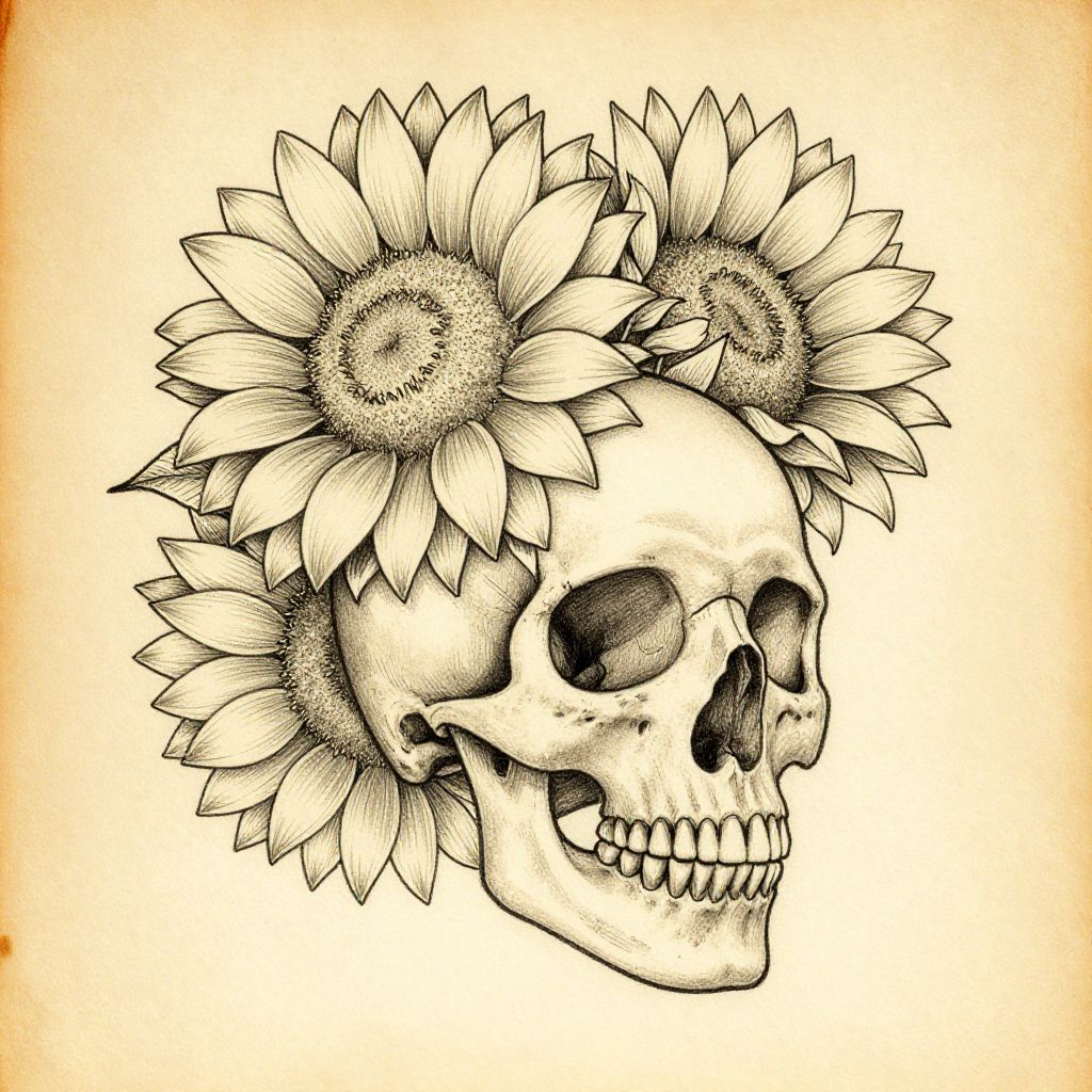 Sketch sunflower skull drawing featuring detailed line art of a human skull intertwined with blooming sunflowers, vintage tattoo style, monochrome with subtle shading, intricate textures on petals and bone structure, on a parchment background.