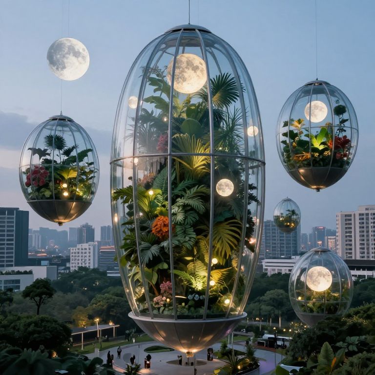 Photograph of five spherical glass planters with glowing lights and tropical plants, hanging in a city park at twilight, with a full moon in the blue