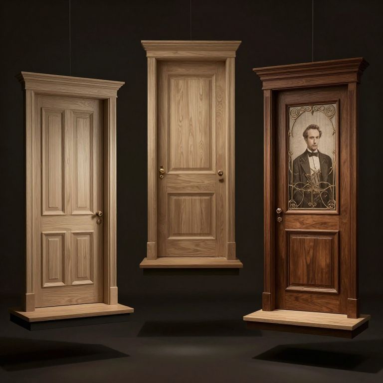 Photograph of three wooden doors displayed against a black background. The left door is light beige with a simple, rectangular design and brass doorknob. The center door, slightly taller, is also light beige with a similar design and a brass doorknob. The right door is dark brown with a detailed glass panel featuring a portrait of a stern-looking man in a black suit and bow tie. Each door is elevated on a beige base, highlighting their craftsmanship and wood grain textures. The lighting accentuates the wood's natural patterns and the glass panel's intricate design.