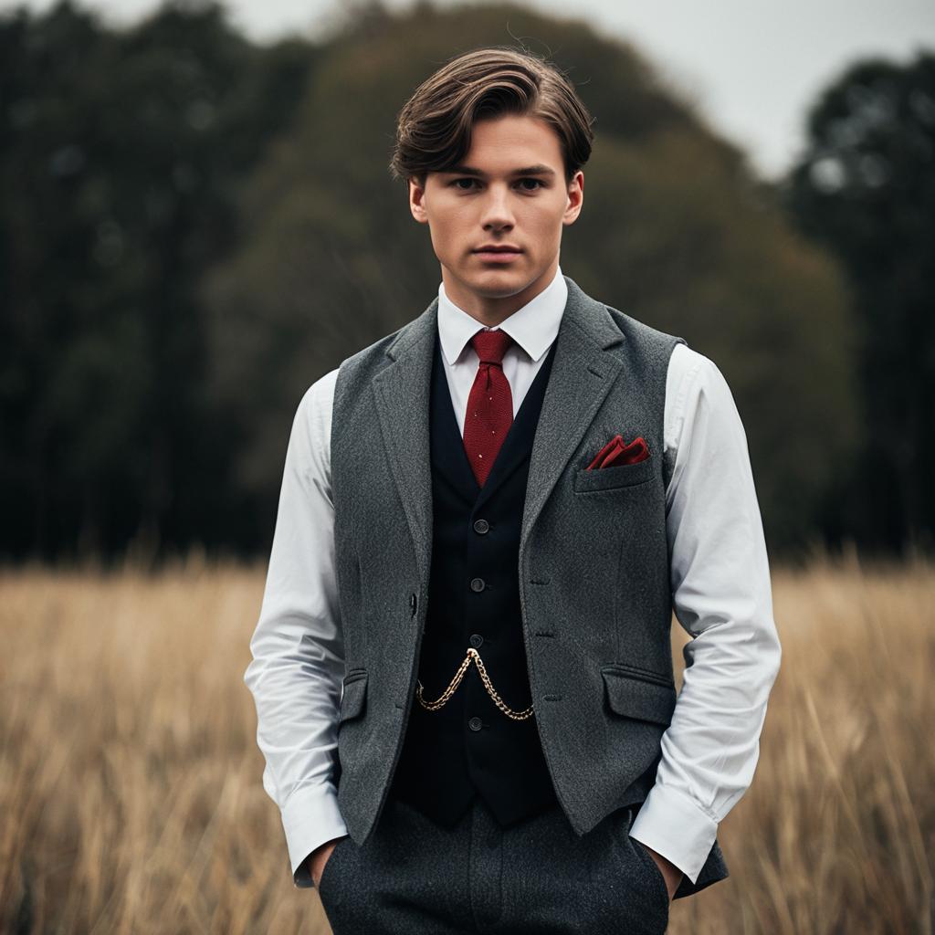 Portrait of a young man wearing a traditional German-inspired outfit, featuring a brown vest, brown overcoat, white collared shirt, and a red striped necktie. The man has brown hair, a well-groomed beard, and is standing outdoors with a blurred natural background. He is looking directly at the camera with hands in pockets, wearing a watch and a patterned pocket square.
