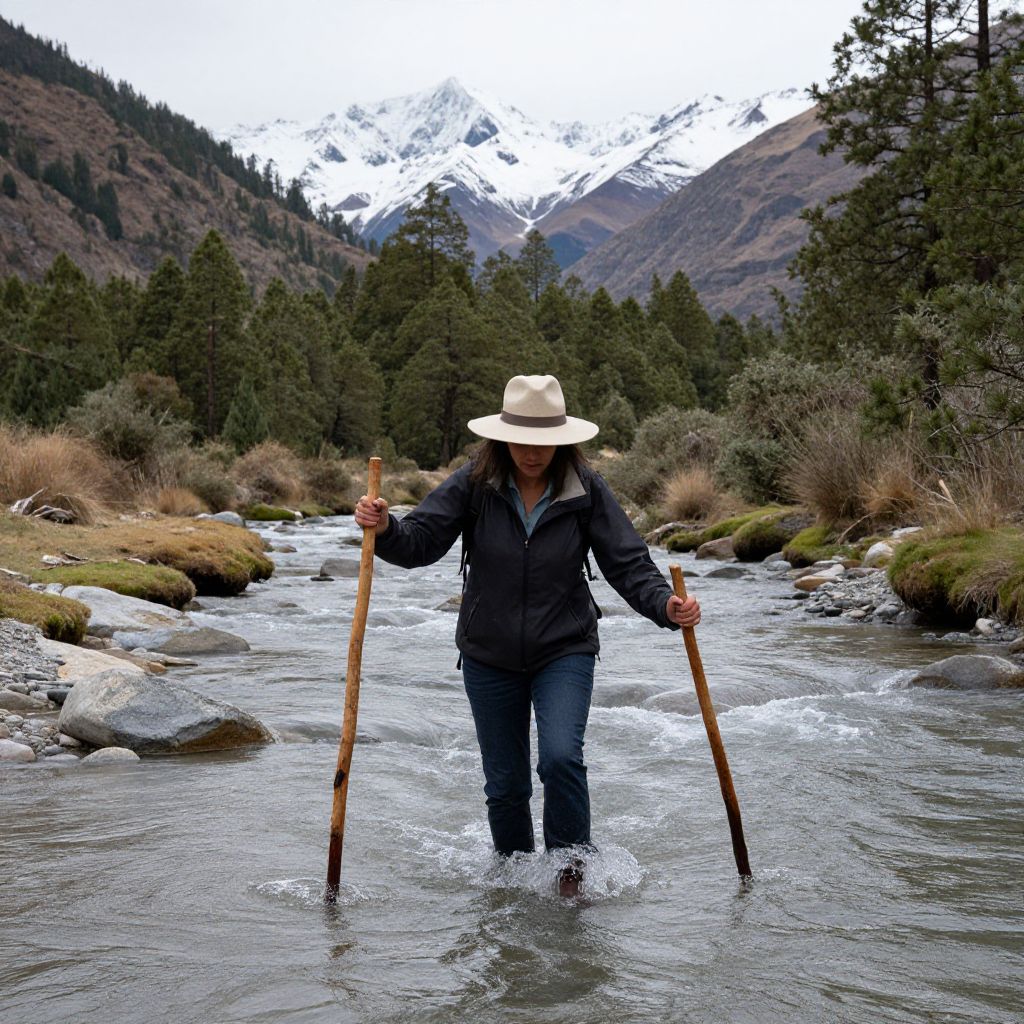Woman wading through a flowing river in Huaraz, using two wooden sticks for balance while wearing a wide-brimmed hat and dark jacket, with snow-capped mountains and dense evergreen forests visible in the background.