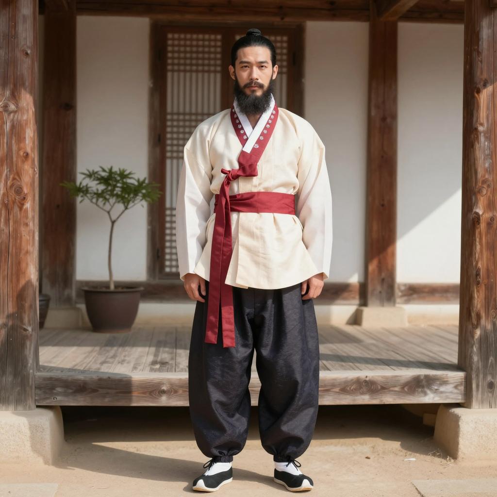 Full body portrait of a bearded Asian man wearing traditional Korean hanbok consisting of a beige top with a red belt and black loose pants. He has a bun hairstyle and stands on a wood-carved porch in front of a traditional Korean building. The scene is set on a sunny day with a potted plant visible in the background.