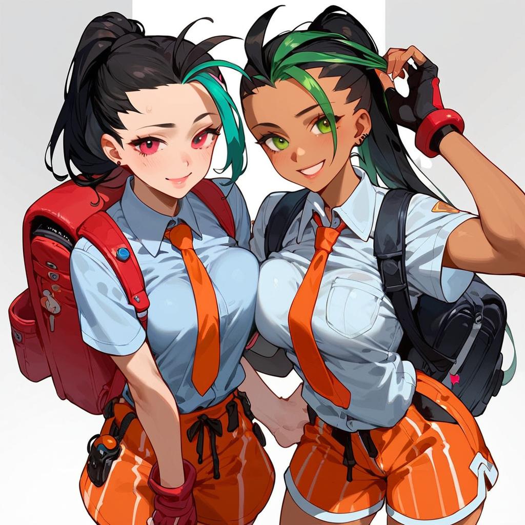 Score_9, score_8_up, score_8, medium breasts, cute, eyelashes, figure, Nemona \(Pokemon\), black hair, green hair, orange eyes, dark skin, multicolored hair, two-tone hair, hair pulled back, collared shirt, fingerless gloves, orange shorts, backpack cowboy shot, smile, looking at viewer