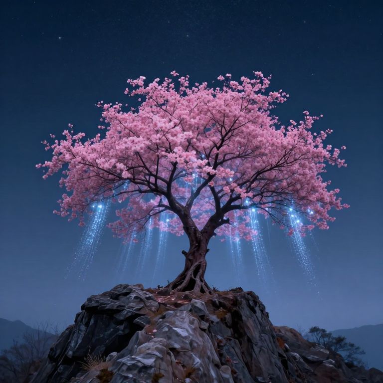 Photograph of a surreal, glowing pink cherry blossom tree with blue light trails against a starry night sky, standing on rocky terrain.