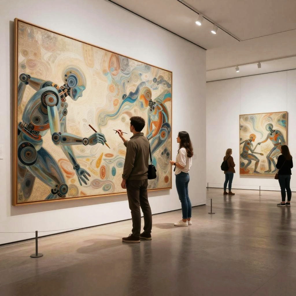 AI drawing pictures depicting a futuristic gallery where intelligent machines collaboratively create large-scale murals with fluid motions, mixing traditional brush techniques with digital enhancements under soft gallery lighting and sleek architecture.