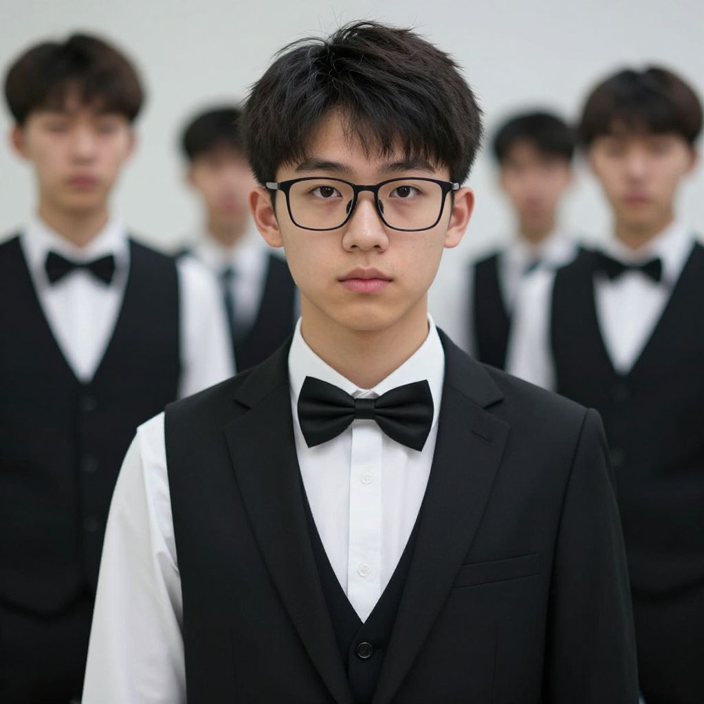 Photograph of an Asian teenage boy with black, slightly messy hair and rectangular black glasses, centered in the foreground. He wears a black tuxedo with a white dress shirt and a black bow tie. His expression is neutral. In the blurred background, three other boys, also Asian, are similarly dressed in black tuxedos with white shirts and black bow ties. The background is a plain, light-colored wall, emphasizing the formal attire of the boys. The image has a crisp, high-contrast look with a focus on the central boy.