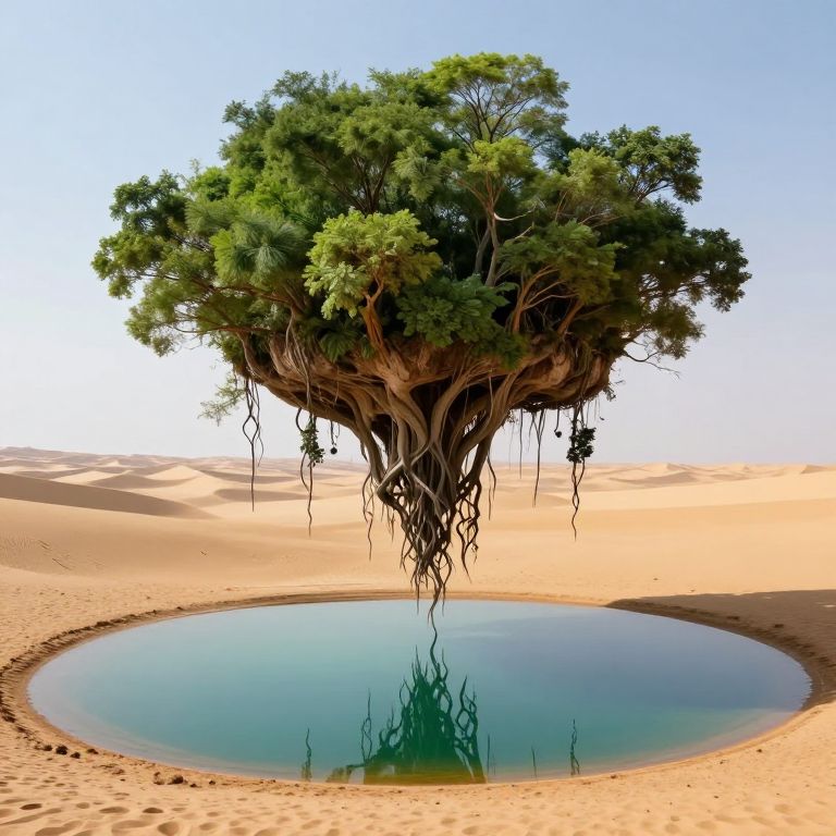 Photorealistic digital artwork of a surreal desert scene featuring a lush, green, tree-like structure with thick, gnarled roots hanging above a circular, pristine, turquoise-blue waterhole. The tree's dense foliage contrasts sharply with the sandy, sunlit desert dunes stretching into the bright blue sky. The waterhole's calm surface reflects the tree's roots and the clear sky above, creating a mirrored effect. The image captures a fantastical blend of natural elements in an arid environment.