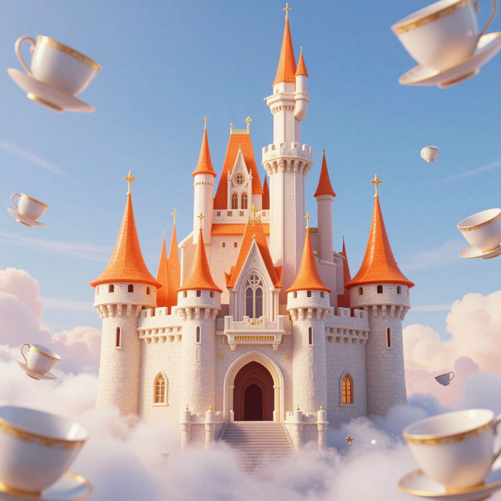 A whimsical 3D-rendered fantasy scene depicts a grand castle adorned with vibrant orange spires, gracefully floating amidst a dreamlike sky dotted with teacups and saucers, evoking a surreal blend of Victorian elegance and celestial wonder, powered by the enchantment of polite discourse and shared tales.