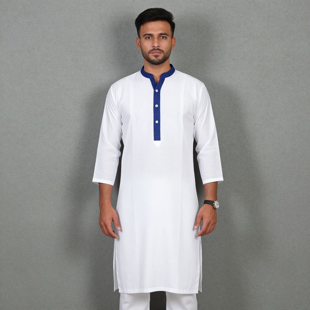 "Shaista Clothing Official, man in a white and blue dress standing in front of a wall"