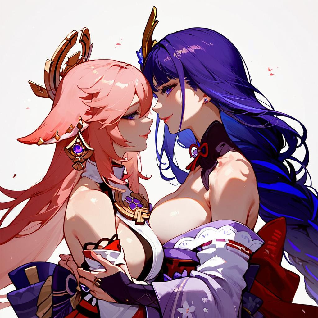Score_9, score_8_up, score_7_up, source_anime, 2girls, yae miko, raiden shogun, genshin impact, smile, looking at another, handshake, japanese clothes, sideboob