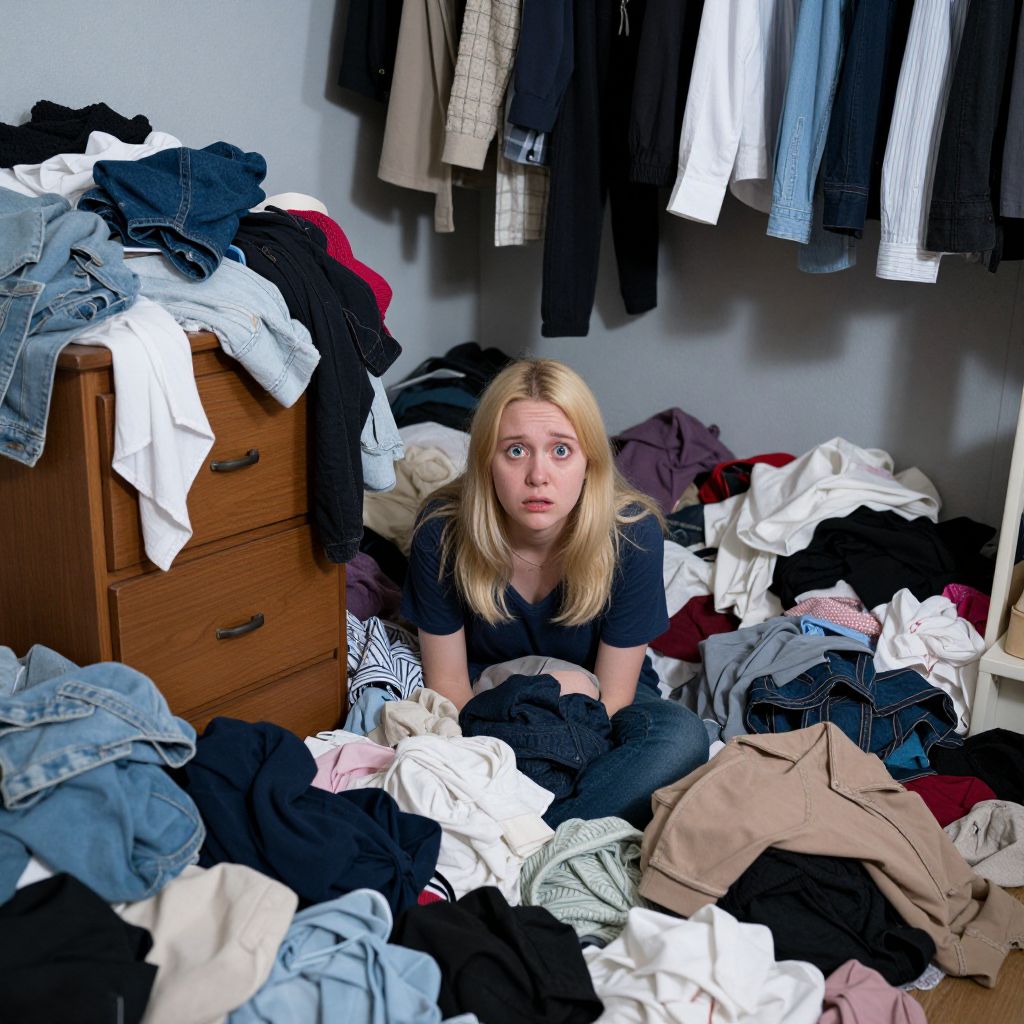 Photograph of a blonde woman with fair skin and blue eyes, sitting amidst a chaotic pile of clothes on the floor in a cluttered bedroom. She wears a navy blue T-shirt and blue jeans, with a surprised expression. The background features a wooden dresser on the left, overflowing with clothes, and a hanging rack above filled with various shirts and jackets. The floor is covered in a mix of denim, white, and patterned clothing, creating a sense of disorganization. The room is lit with artificial light, highlighting the mess and the woman's central position.