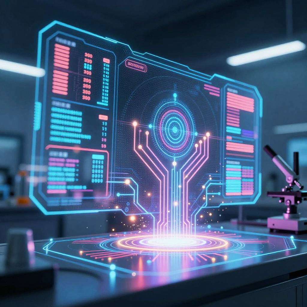 Tracer rule depicted as a dynamic, futuristic interface in a cyberpunk laboratory, holographic displays highlighting cutting-edge scientific data, vibrant neon colors, intricate circuit patterns, and glowing particle effects in a sleek, high-tech environment.
