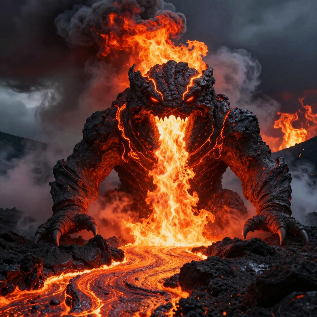 Giant lava monster made of molten rock and glowing magma veins, bellowing flames from its mouth, chaos erupting around it as molten rivers flow, volcanic ash swirling in the air, dramatic shadows cast on the scorched earth under an ominous, fiery sky.