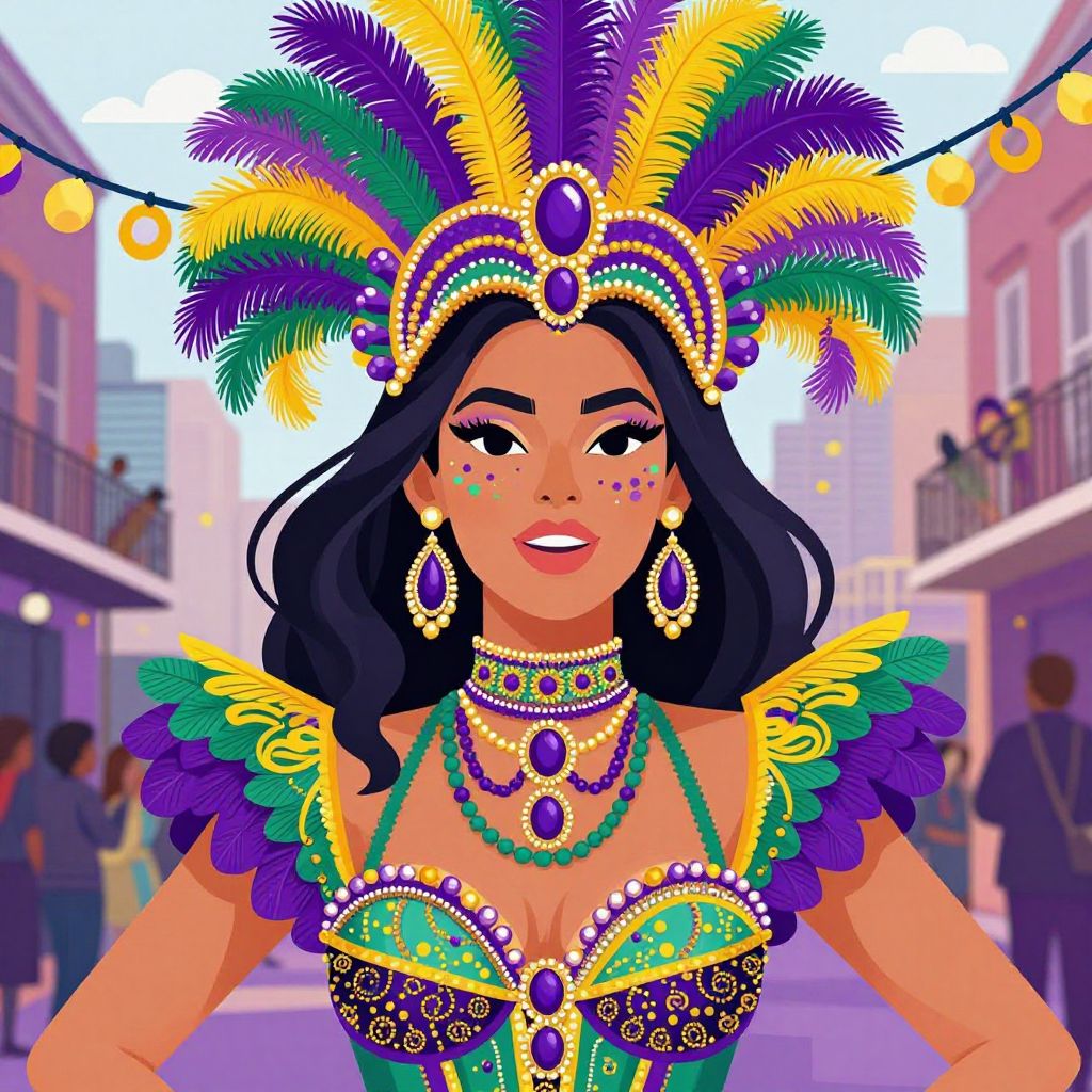 A vibrant digital illustration featuring a woman adorned in ornate Mardi Gras attire, showcasing intricate vector art with bold colors and detailed patterns, reminiscent of the festive spirit of New Orleans, rendered in a high-definition, computer-generated style.