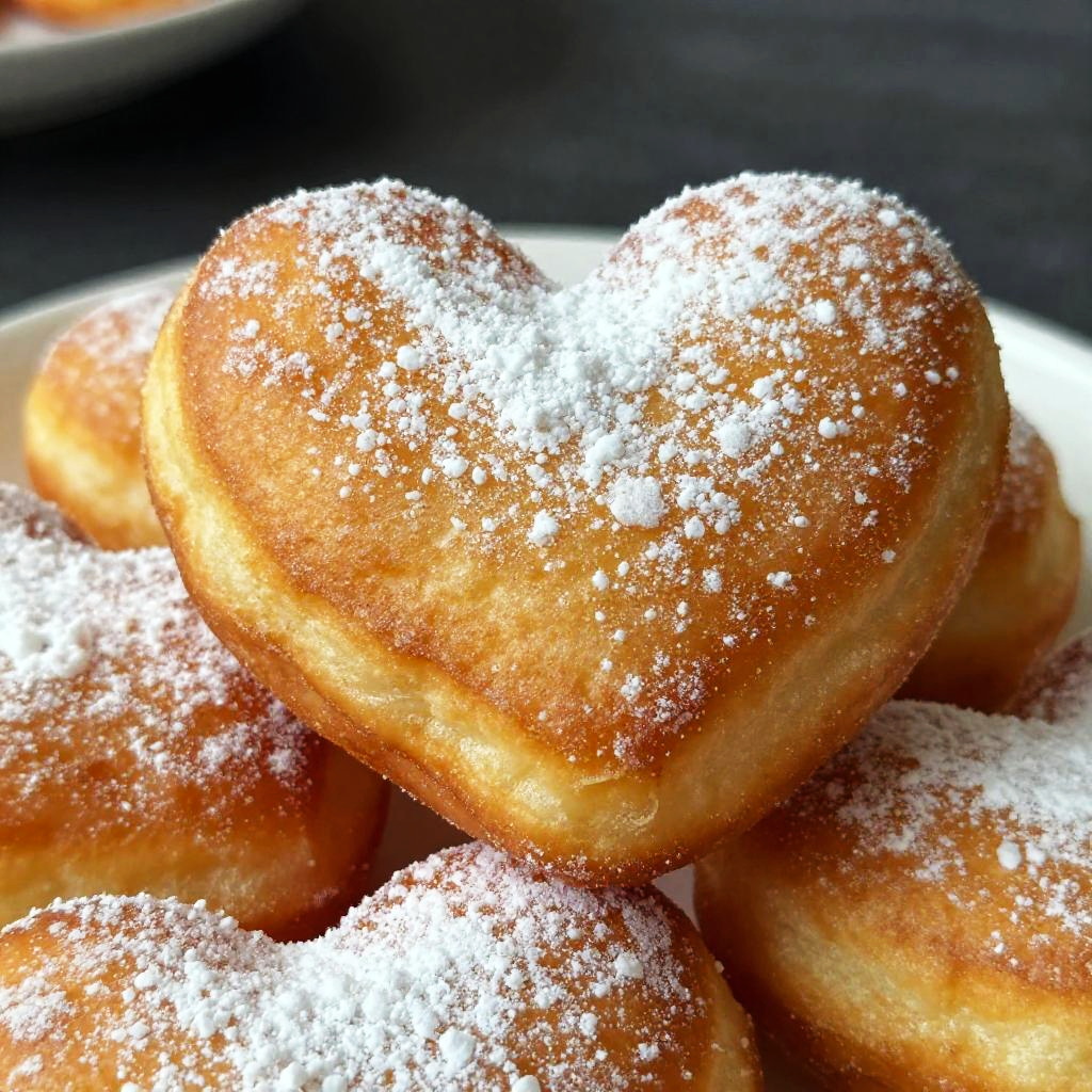 Close-up image of golden brown, heart-shaped fried dough pastries dusted with powdered sugar. The pastries have a slightly crispy texture and are stacked on a plate with a blurred dark background, emphasizing their warm and inviting appearance.