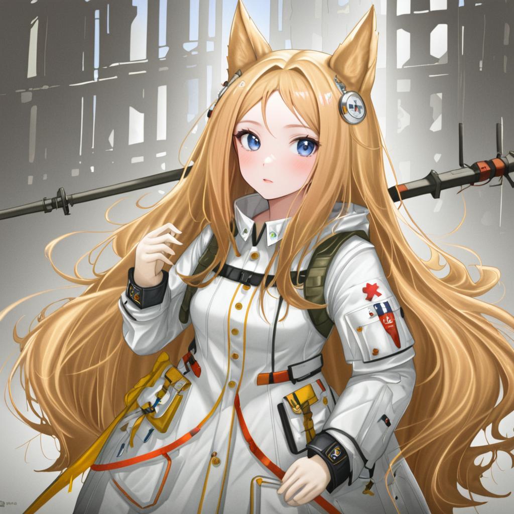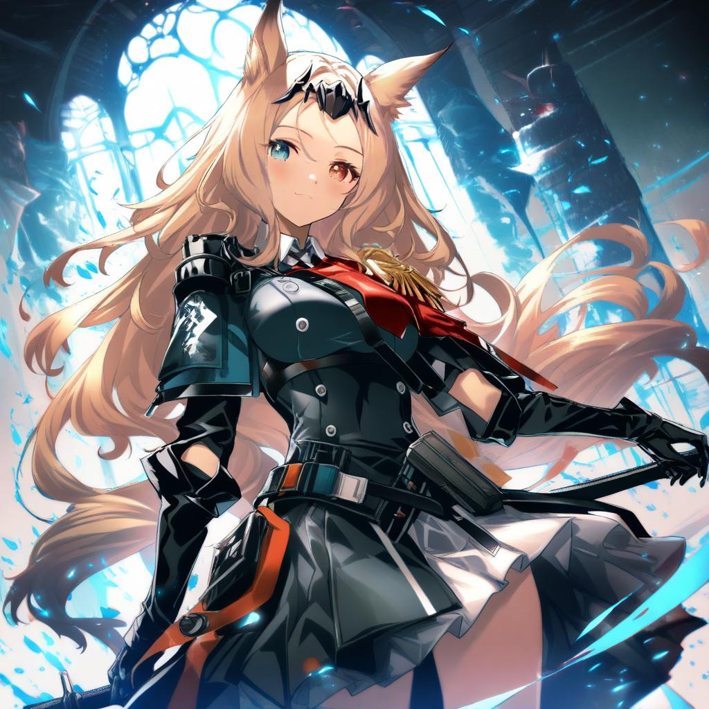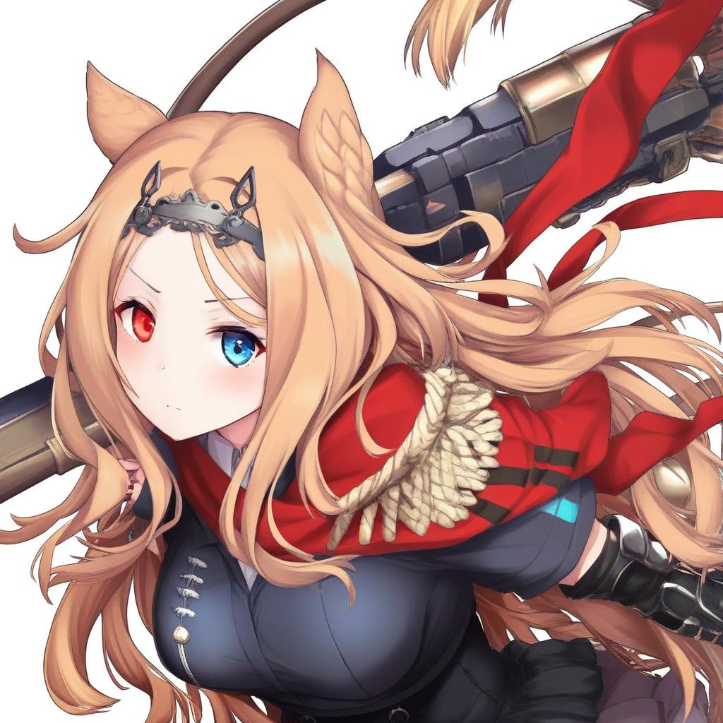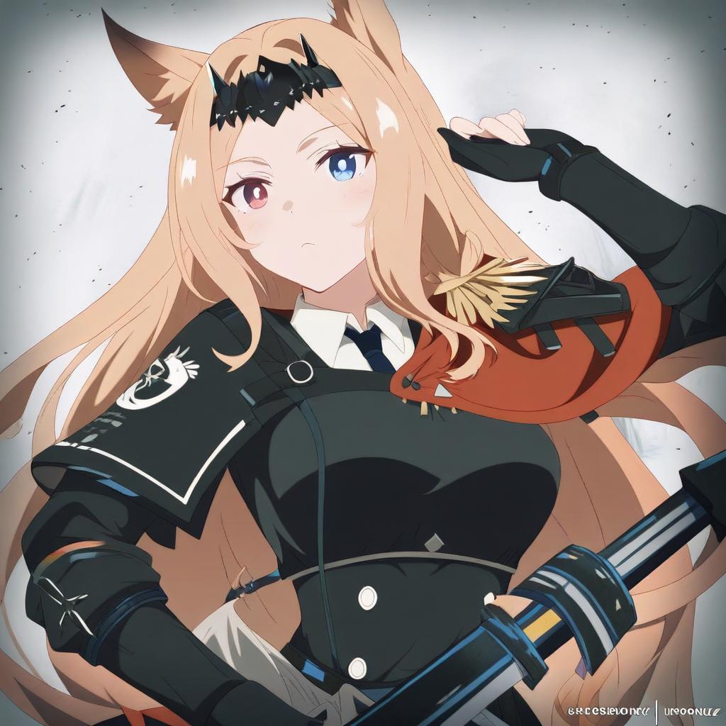Archetto (arknights), arknights, 1girl, heterochromia, animal ears, blue eyes, red eyes, blonde hair, very long hair, long hair, brown hair, medium breasts, by artist pot-de, animagine