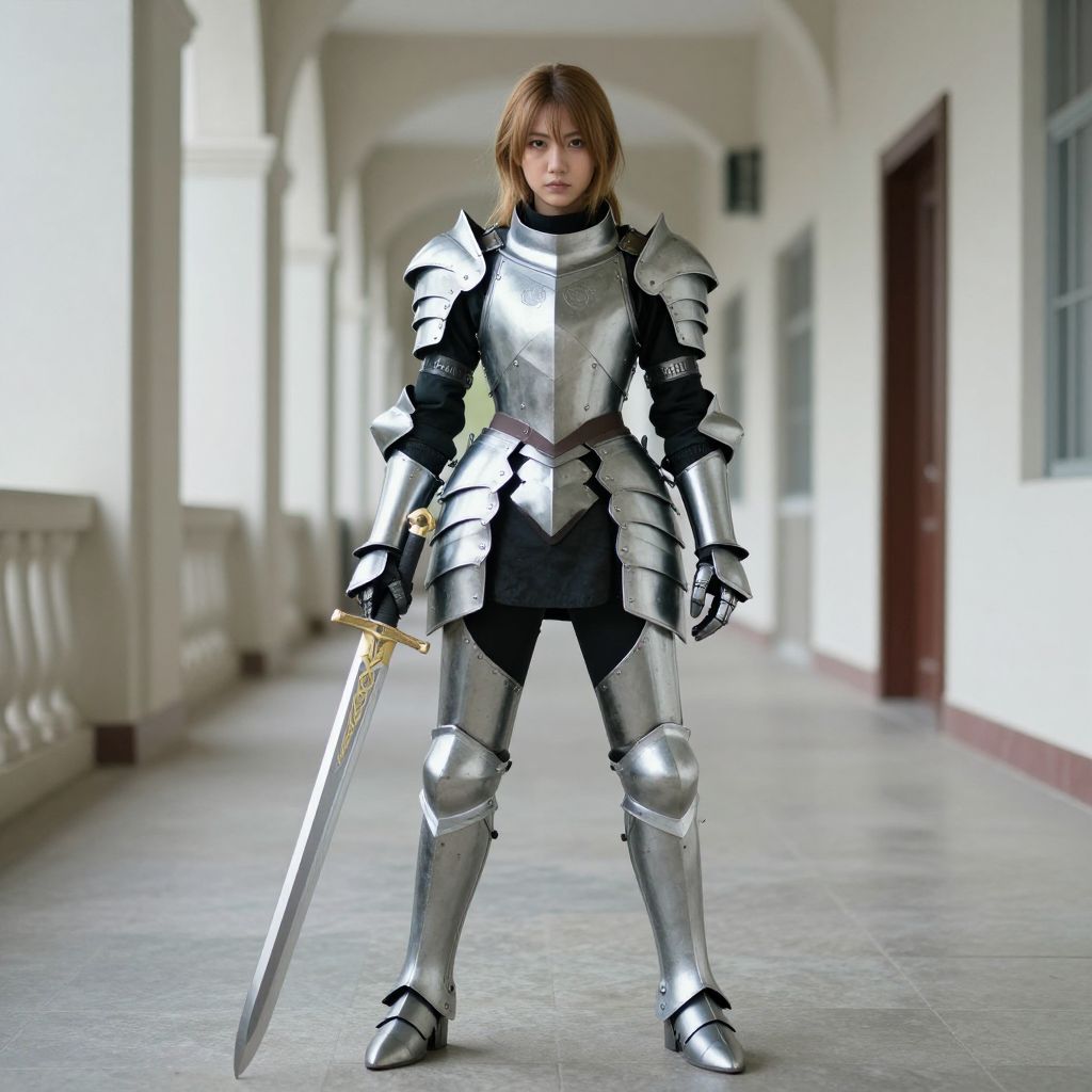 Photograph of a young woman with light brown, shoulder-length hair standing in a bright, arched corridor with white walls and marble flooring. She is wearing full, shiny silver medieval armor with intricate designs, including a breastplate, pauldrons, and gauntlets. Her expression is serious and focused. She holds a long, silver sword with a gold hilt in her right hand, positioned down by her side. The corridor has large, arched windows on the left and a red door on the right. The lighting is natural, creating soft shadows. The overall scene conveys a sense of readiness and bravery.