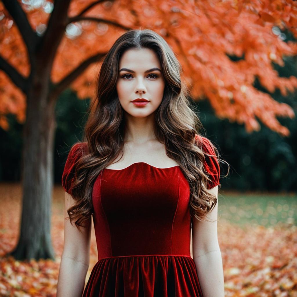 Brown dress halloween ,1girl, solo, dress, brown hair, long hair, tree, red dress, autumn, realistic, blurry, blurry background, outdoors, looking at viewer, wavy hair, autumn leaves, lips, photorealistic