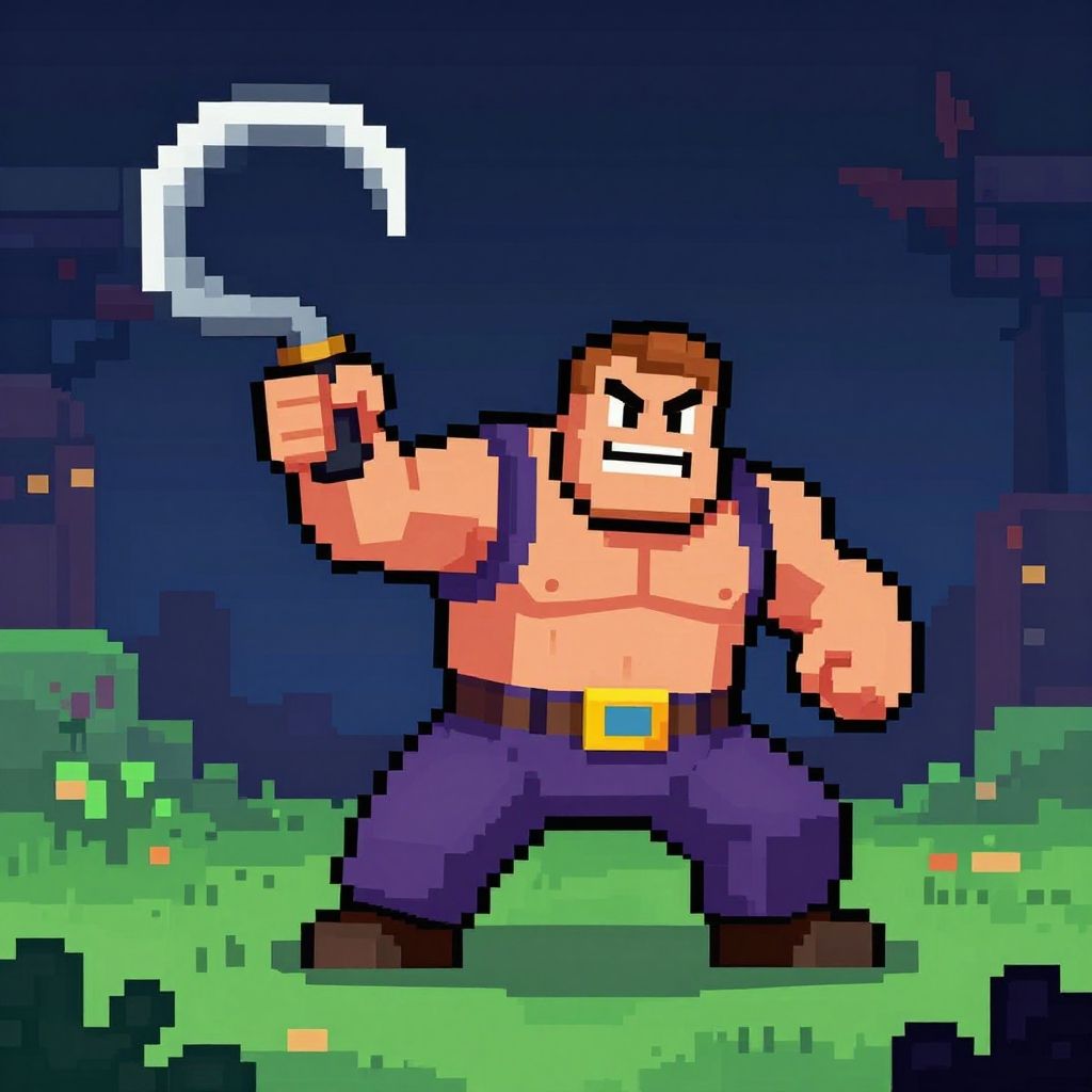 Pudge Dota 1 rendered in classic pixel art style, vibrant colors, dynamic pose throwing hook, dark fantasy landscape, retro game inspired background