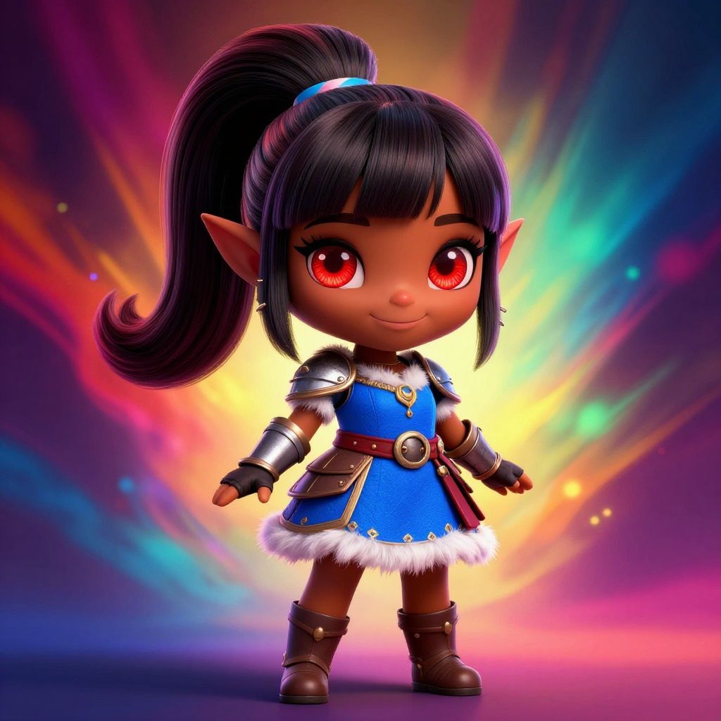 Digital artwork of a cute, chibi-style fantasy character with dark brown skin, large red eyes, and pointed elf ears. She has long black hair in a high ponytail, wearing a blue dress with white fur trim, silver armor on her shoulders and arms, and brown boots. A brown belt with a round buckle is fastened at her waist. The background is a vibrant, colorful burst of light with purple, pink, yellow, and green rays, creating a dynamic and energetic atmosphere. The character stands confidently in the center of the image.