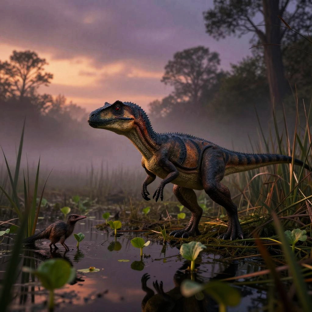 Velociraptor caught on camera stalking prey at the edge of a misty swamp, water plants and reeds surrounding the scene, mysterious and eerie atmosphere, realistic textures and shadows, dusk lighting with orange and purple hues