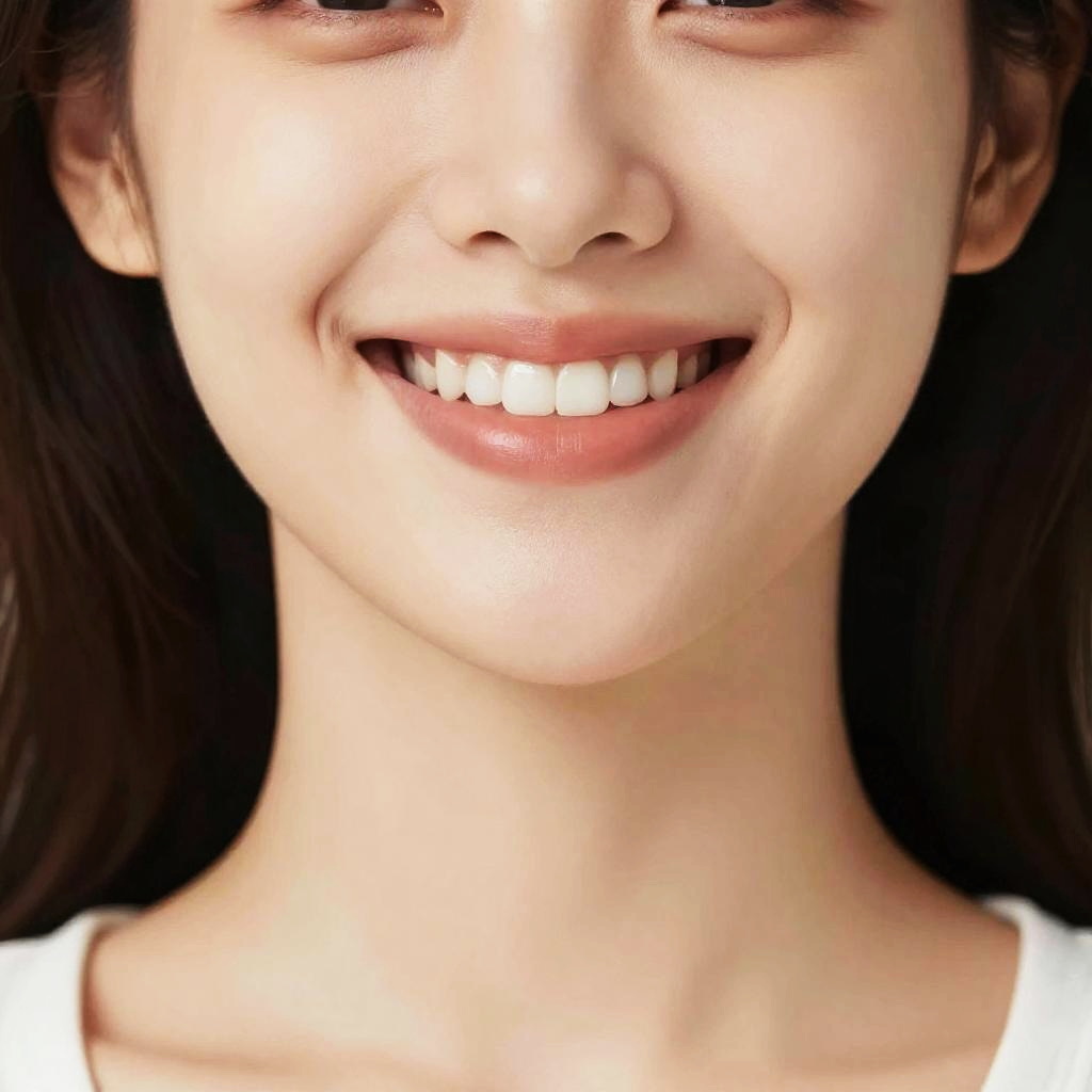 Get rid of double chin in photo, stylized artistic portrait of a smiling woman, refined neck and chin area, vibrant color palette, soft-focus background, high definition, modern photo editing with emphasis on natural beauty, smooth skin texture and enhanced facial symmetry