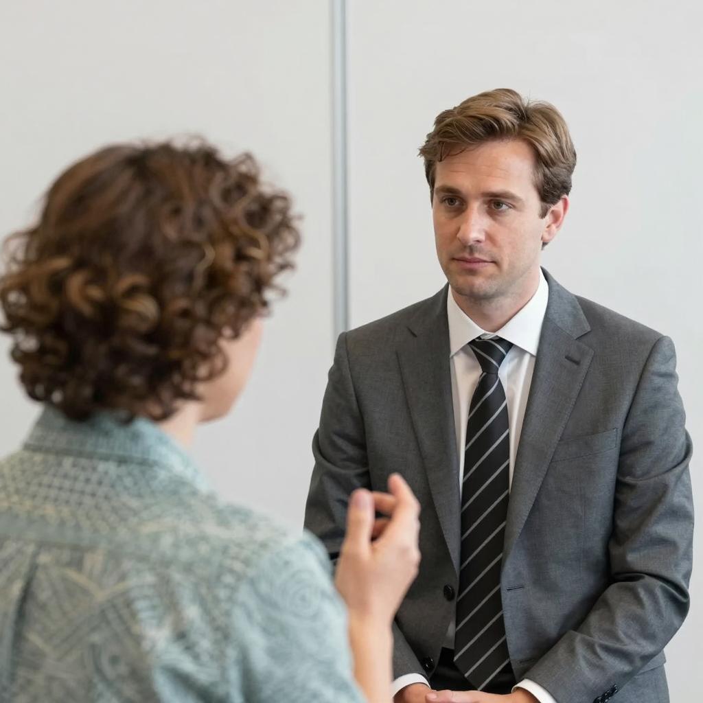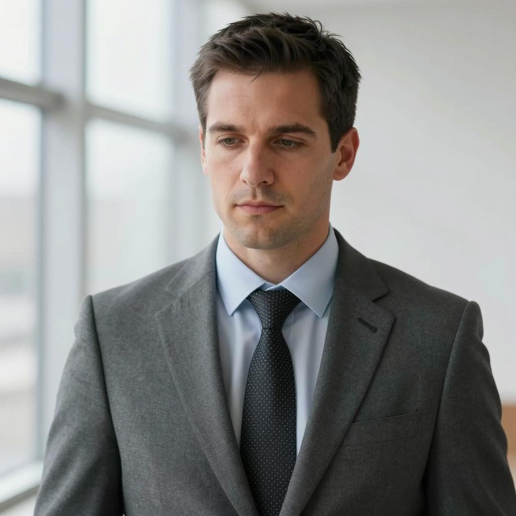 A white man with short dark hair, wearing a gray suit, light blue shirt, and black tie with white pattern. He looks slightly downward with a neutral expression. Blurred white window background. Upper body visible.