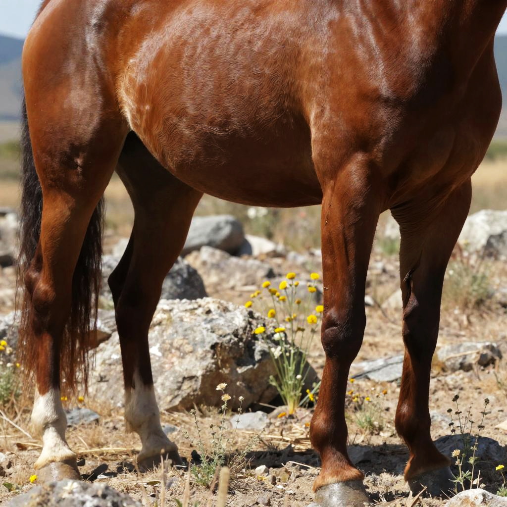 Close-up of a really buff horse's torso and legs, muscles rippling under glossy chestnut coat, standing on rocky terrain with wildflowers, natural sunlight highlighting each muscle fiber, extremely detailed anatomy study with realistic shading and texture.