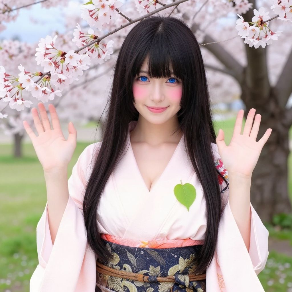 Photograph of a smiling Japanese woman with long black hair, wearing a white kimono with floral patterns, waving under pink cherry blossom trees.