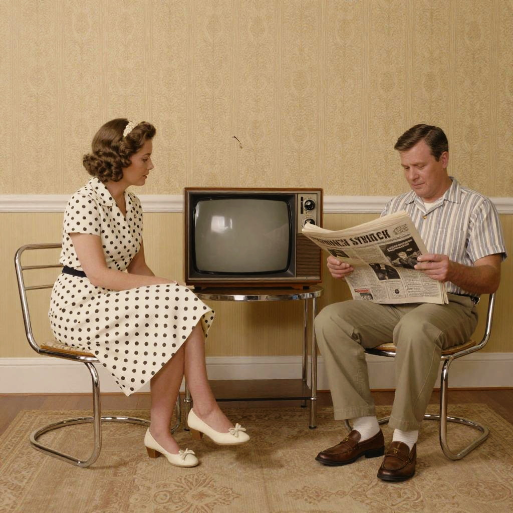 50's style family living room, chrome furniture, patterned wallpaper, vintage television set, mother in polka dot dress and father reading newspaper, warm tones and nostalgic feel, detailed textures evoking mid-20th century home life.