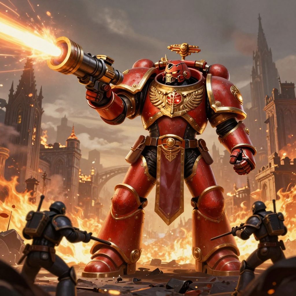Guts space marine wielding a massive plasma sword, amidst a chaotic space war scene, surrounded by exploding starships and robotic enemies, detailed futuristic armor with worn metal textures, intense expression, dynamic pose with sparks and smoke effects.