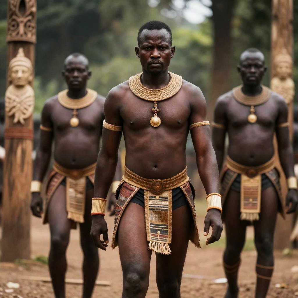 Photograph of a muscular African man in tribal armor, with a stern expression, walking forward. Two other men in similar armor stand in the background. Wooden posts with carvings and dim lighting. Forest setting. Three people, intense expressions.