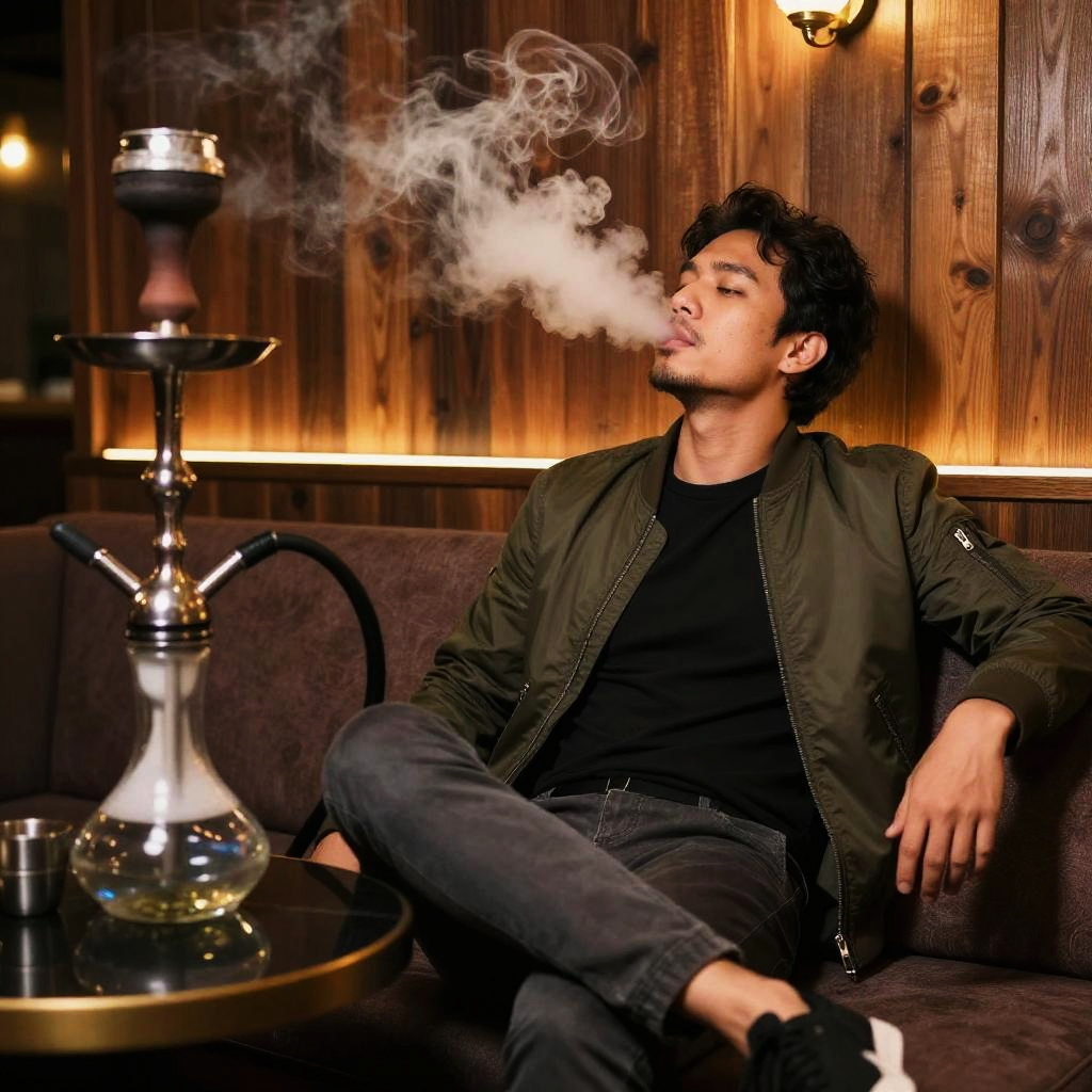 Man smoking shisha, adult man lounging in a stylish hookah bar, East Asian man with short wavy hair and light stubble wearing olive green bomber jacket over a black crew-neck tee and tapered charcoal chinos, leaning back against a sofa with head tilted upward, exhaling a long plume of smoke toward the ceiling, tall dark glass hookah standing on the table beside him, warm cosy lighting with wooden wall panels in the background, moody nightlife atmosphere, realistic photography, high resolution