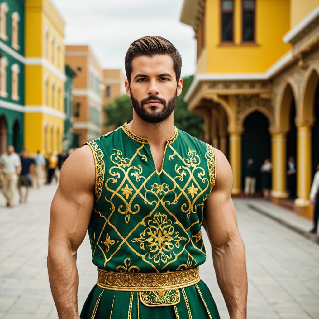 Guy costume, photorealistic, young handsome man, standing in front of yellow buildings, wearing sleeveless green and gold tunic with ornate patterns, muscular arms, short brown hair, neatly groomed beard, serious expression, daytime, outdoor setting, people in background, shallow depth of field, high detail, fashion photography, elegant, strong, classic style