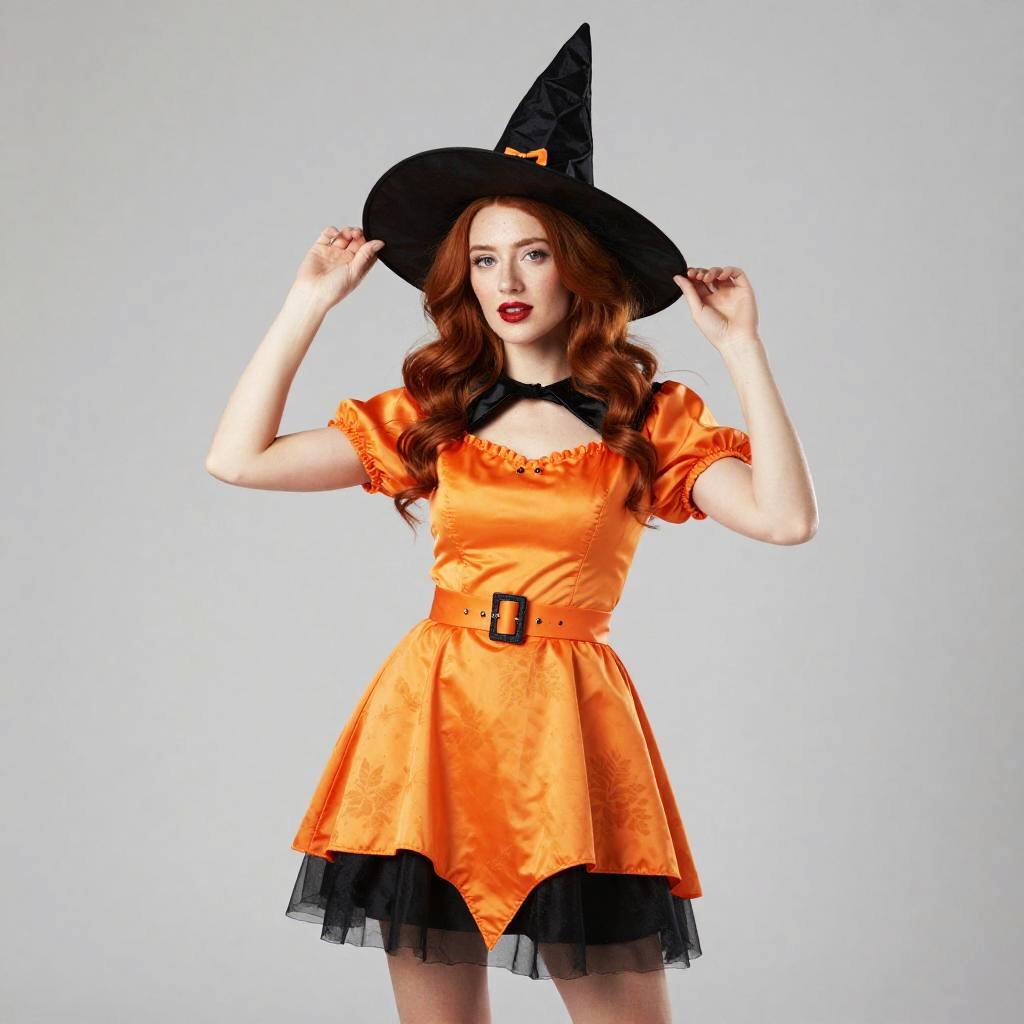 Orange Witch Costume Adult, woman with red hair wearing a hat and orange dress