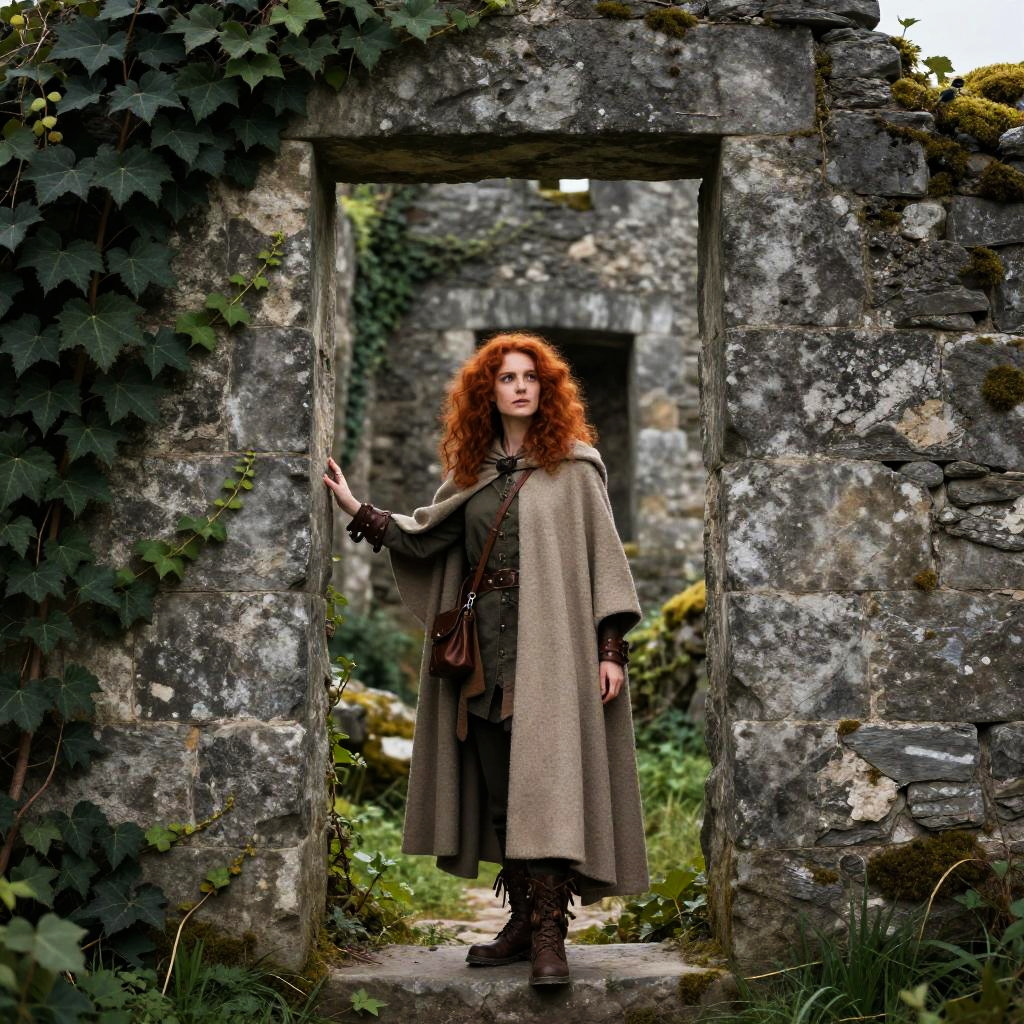 Photograph of a fair-skinned, red-haired woman standing in a weathered stone doorway, framed by ivy. She wears a beige, floor-length cloak over a dark, medieval-style dress with a brown belt, and black leather boots. Her long, curly hair cascades around her shoulders. The stone doorway is moss-covered, with greenery visible in the background. She gazes directly at the camera with a calm expression. The image has a fantasy, medieval aesthetic, with natural light highlighting her features and the textures of the stone and ivy.