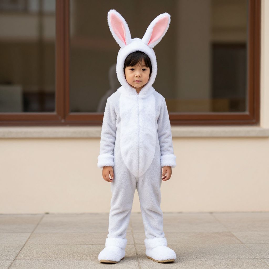 Photograph of an Asian toddler standing outdoors on a tiled surface, wearing a white, plush bunny onesie with pink-tipped ears. The child has short black hair and a neutral expression. The background features a beige wall and a large, dark brown-framed window. The onesie is soft and fluffy, with a zipper down the front and white fur trim around the cuffs and feet. The toddler's small hands rest by their sides. The lighting is natural, with soft shadows.