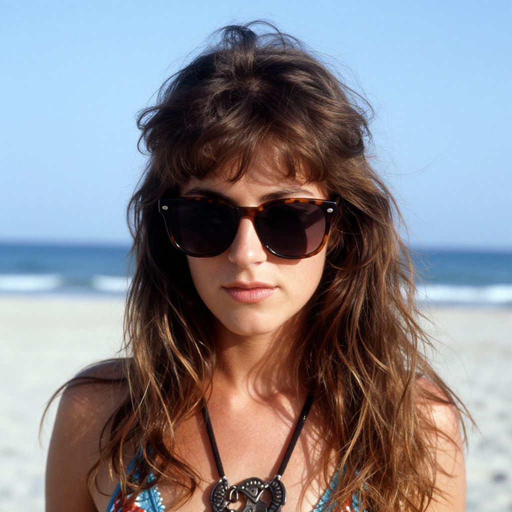 Beach woman with sunglasses, enface, looking down, hippie photo, real photo, 1980 photo style, super detailed, super realistic,