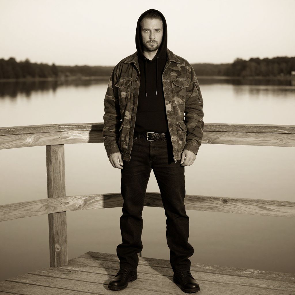 Photograph of a muscular, bearded man standing on a wooden dock by a calm lake at sunset. He has a stern expression, dark hair, and wears a camo jacket over a black hoodie, black pants, and black boots. A thick black belt with a silver buckle is visible. The background features a blurred lake and treeline, with the wooden railing extending horizontally behind him. The image has a monochromatic, high-contrast style, emphasizing the man's strong, imposing presence against the serene natural setting.