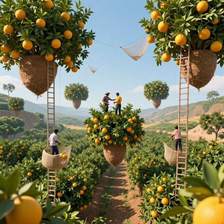 A vibrant digital CGI image depicting a sunlit citrus orchard with hanging orange trees. Five people, wearing casual clothing in shades of yellow, white, and pink, climb ladders to harvest oranges from large, suspended woven baskets. The background features rolling hills and a clear blue sky. The lush green leaves and bright orange fruits contrast with the earthy ground path. Nets hang between the trees, adding a rustic touch. The image exudes a whimsical, almost surreal atmosphere with its imaginative, floating trees and vivid colors.