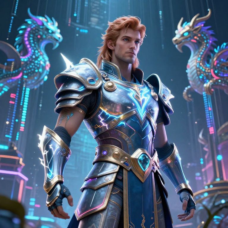 This digital CGI image features a muscular, fair-skinned man with red hair wearing ornate, metallic armor adorned with blue and gold accents. His armor, intricately designed with glowing blue runes, covers his shoulders, chest, and forearms. He stands confidently in a futuristic, neon-lit environment with two glowing, dragon-like statues in the background. The scene is illuminated by blue and purple lights, adding a cyberpunk aesthetic. The man's expression is serious, and his gaze is directed forward. The image is highly detailed, with a focus on the metallic textures and vibrant lighting.