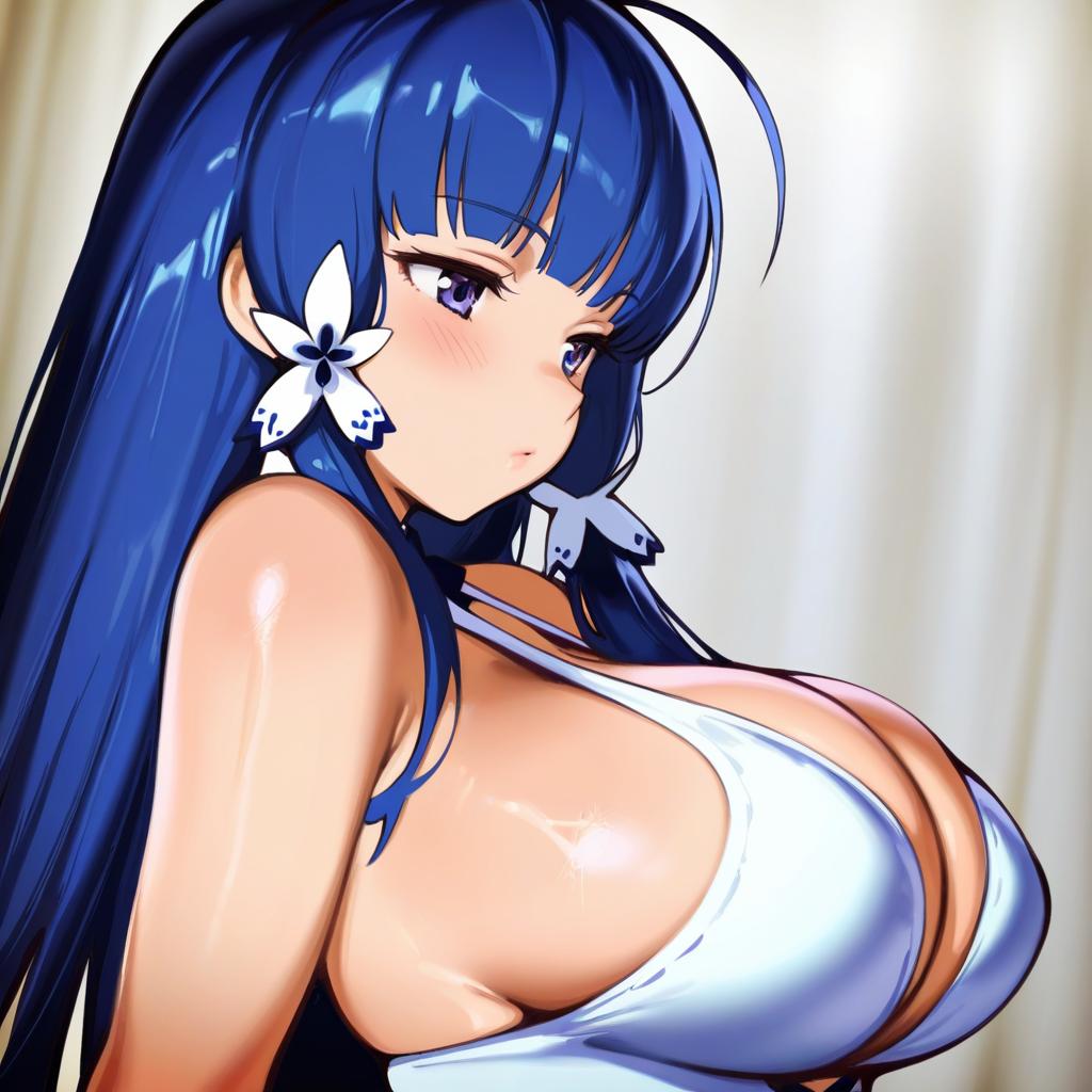 Arin, pangya, 1girl, blue eyes, purple eyes, long hair, blue hair, large breasts, by artist nakamura regura, illustrious