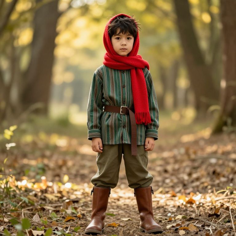 A young boy with messy brown hair, wearing a weathered brown hat and a cozy brown scarf, stands in a quiet, lush forest. The sunlight filters through the tall trees, casting dappled shadows on the forest floor. Leaves rustle gently in the breeze, and a small stream flows nearby. The boy looks curious and adventurous, one hand resting on a tree trunk, his eyes glistening with wonder as he takes in the natural beauty around him.
